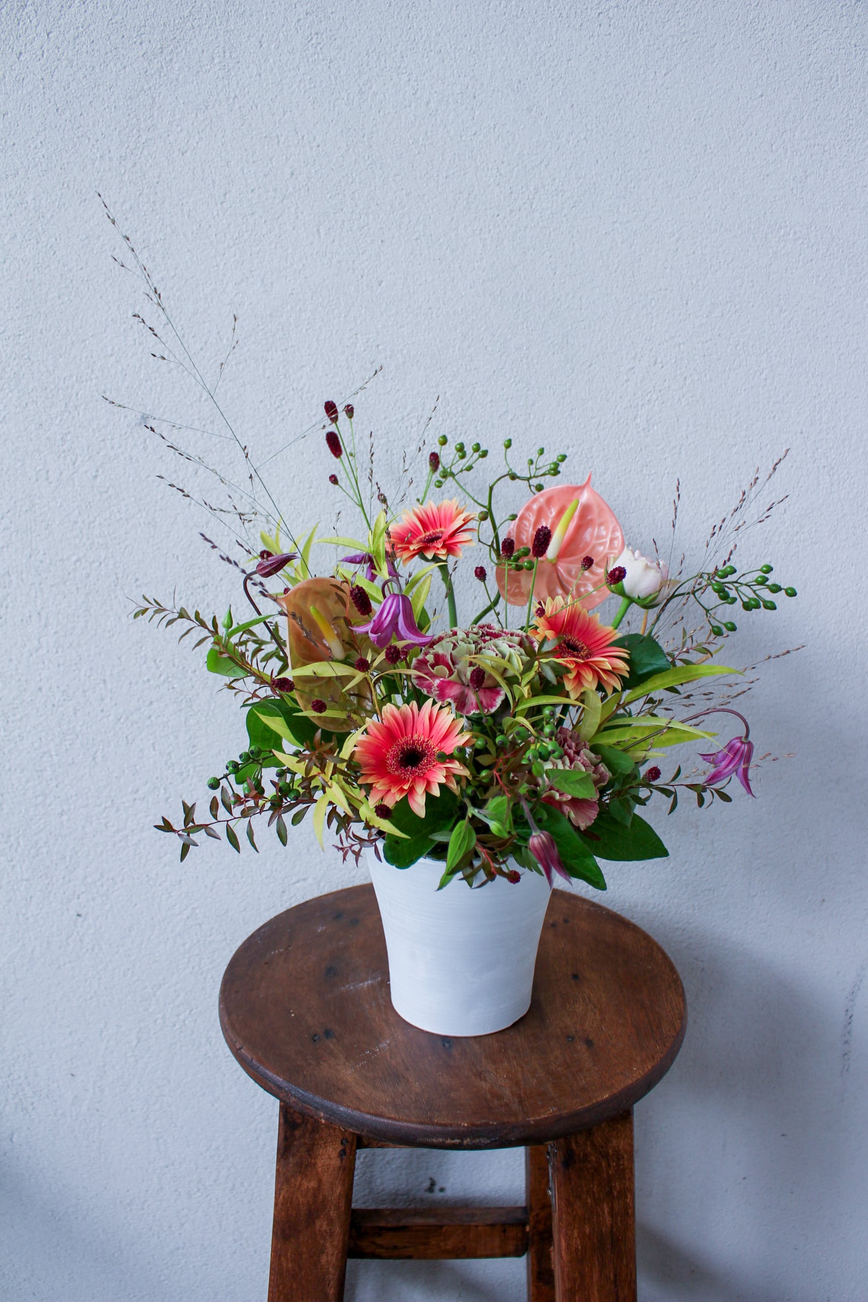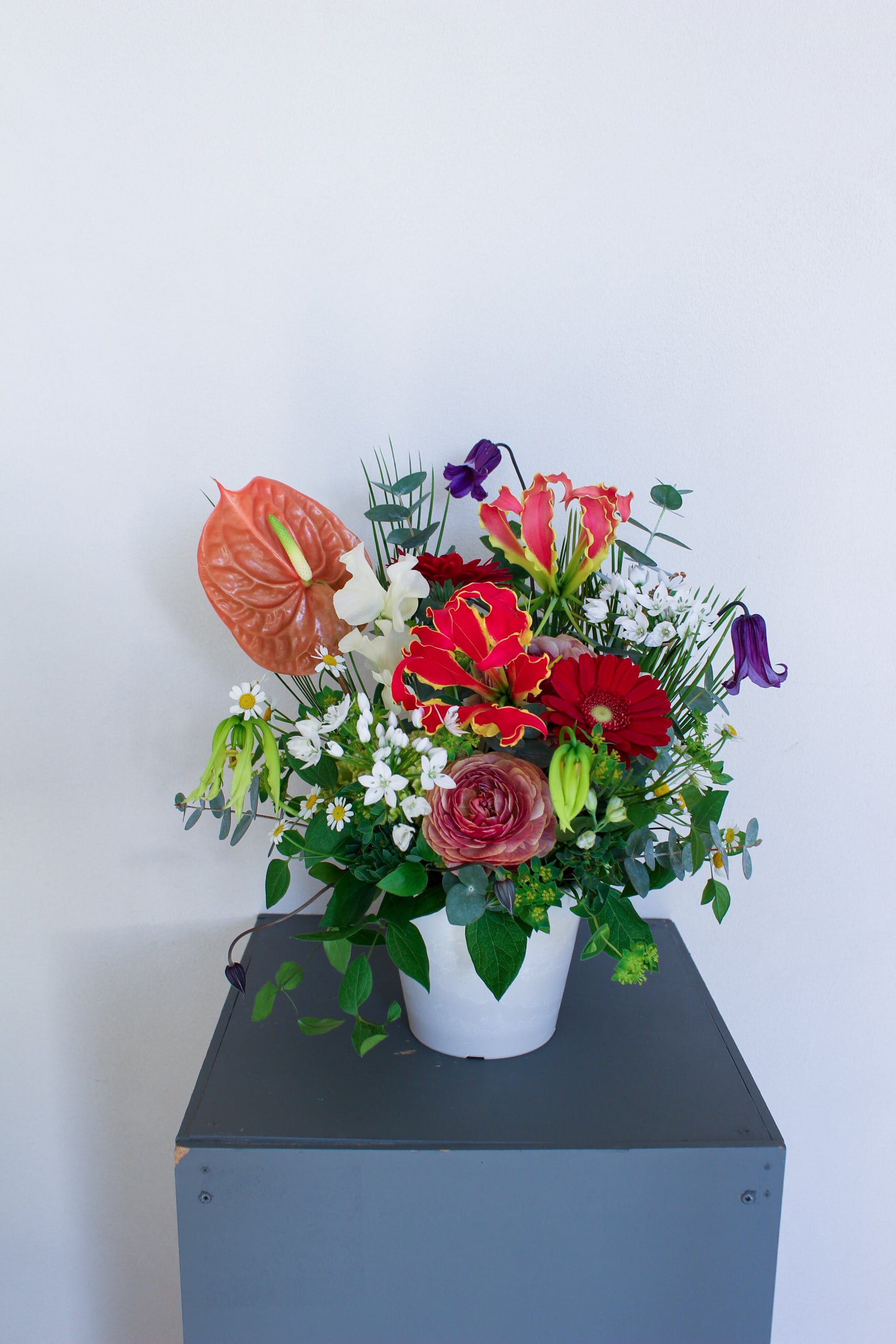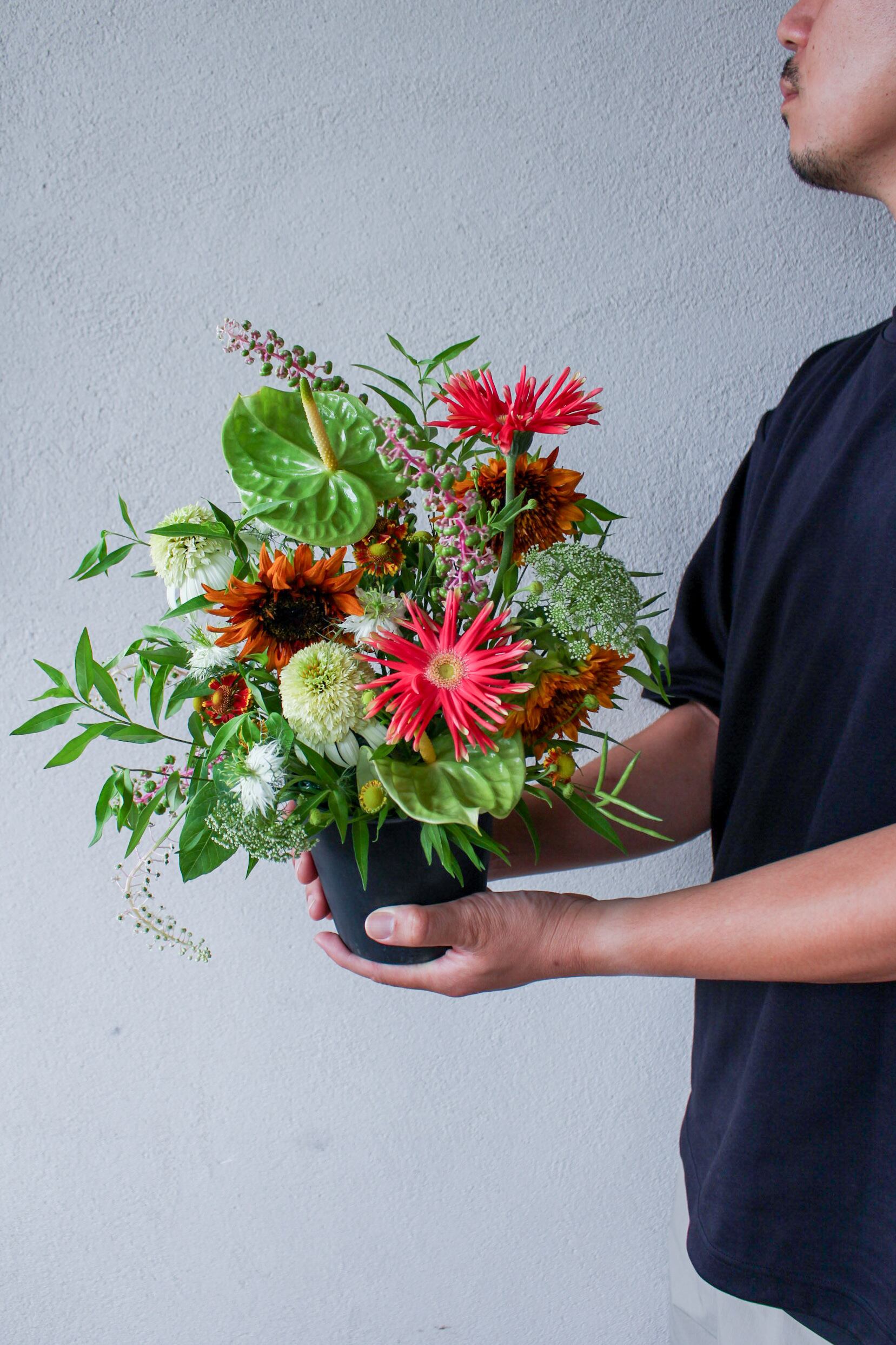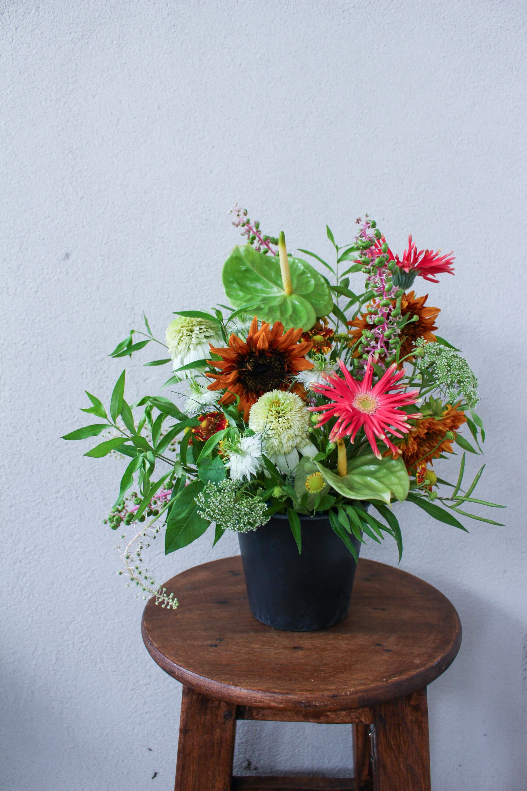 季節のお花を使った置くタイプのアレンジメントです。